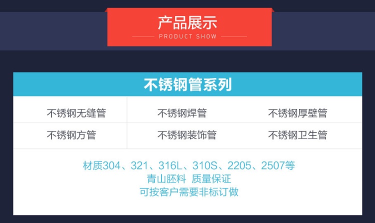 贊譽公司主要生產以201、202、304和316材質為主的不銹鋼品用,機械構造用,建筑裝飾用不銹鋼焊管,同時也可按照客戶要求定做:310、430 、409等各種材質。